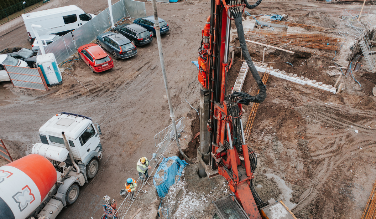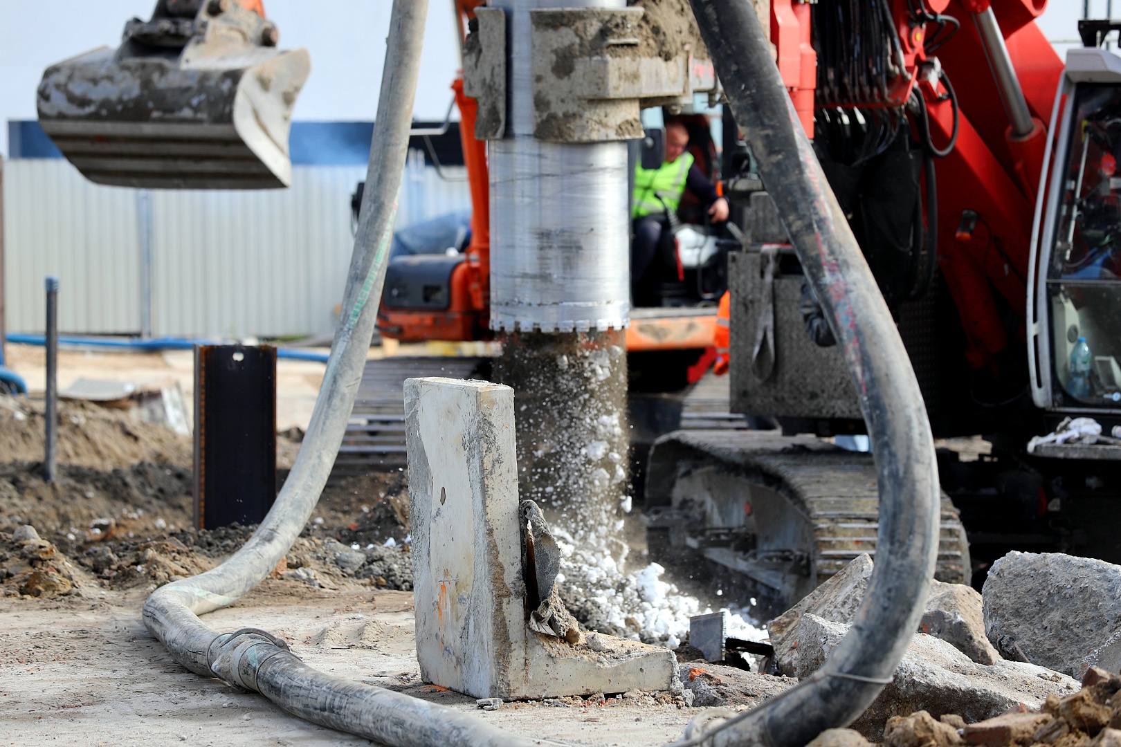• Formowanie pali wierconych w rurze osłonowej odbywa się za pomocą maszyny z podwójną głowicą obrotową. Podczas wiercenia świdrem, urobek wynoszony jest na powierzchnię.